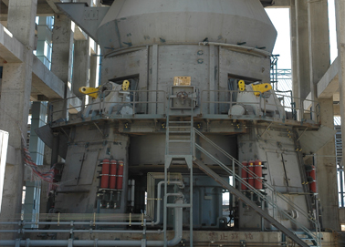 電動機通過減速機帶動磨盤轉動,物料經喂料器從進料口落在磨盤中央,同時熱風從進風口進入磨內。隨著磨盤轉動,物料在離心力作用下,向磨盤邊緣移動,經過磨盤上環形槽時受到磨輥碾壓而粉碎,粉碎后物料在磨盤邊緣被風環高速氣流帶起,大顆粒直接落到磨盤上重新粉磨,氣流中物料經過上部選粉機時,在旋轉轉子作用下,粗粉從錐斗落到磨盤重新粉磨,合格細粉隨氣流一起出磨,通過收塵裝置收集,即為產品,含有水分物料在與熱氣流接觸過程中被烘干,通過調節熱風溫度,能滿足不同濕度物料要求。通過調整選粉機,可達到不同產品所需粗細度。